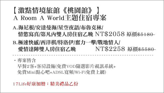 商品訊息簡述: 只要2058元起(雙人價)即可享【激點情境旅館《桃園館》】 原價最高5580元A Room A World主題住宿專案:(A)海尼根/安達曼海/星空夜語/布儒J林/情慾寫真/第凡內雙人房住宿乙晚/(B)極速快感/西洋棋/特洛伊/奮力一擊/戰地情人/愛情達陣雙人房住宿乙晚,專案皆含早餐2客+客房設施(免費VOD隨選影片視訊系統+免費Mini點心吧+ADSL寬頻/Wi-Fi免費上網),17Life好康加贈:精美禮品乙份。